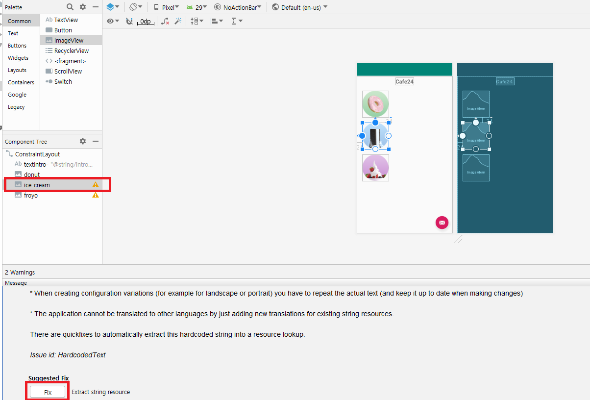경고 표시를 클릭하고 하단의 Fix를 클릭해서 hardcoed된 String에 대한 name을 정할 수 있습니다.