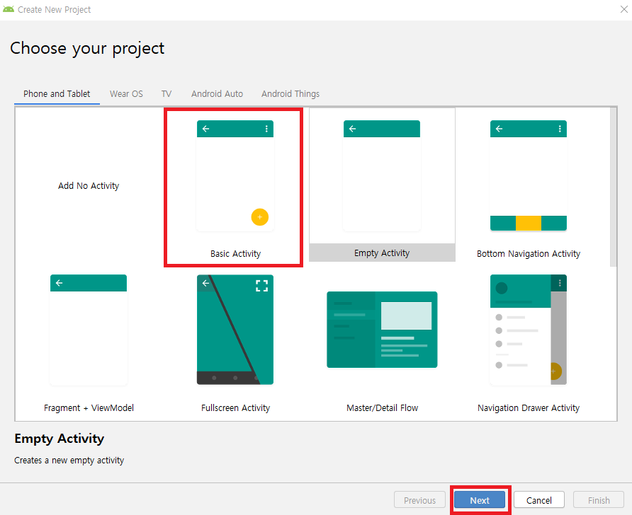'Basic Activity'로 프로젝트를 생성하면 기본적으로 1) activity_main.xml 과 2) content_main.xml 이 생겨납니다.