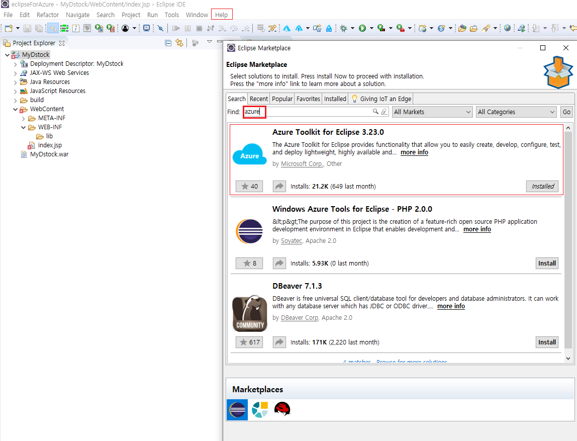1. Eclipse Market Place에서 'Azure Toolkit for Eclipse' 다운
