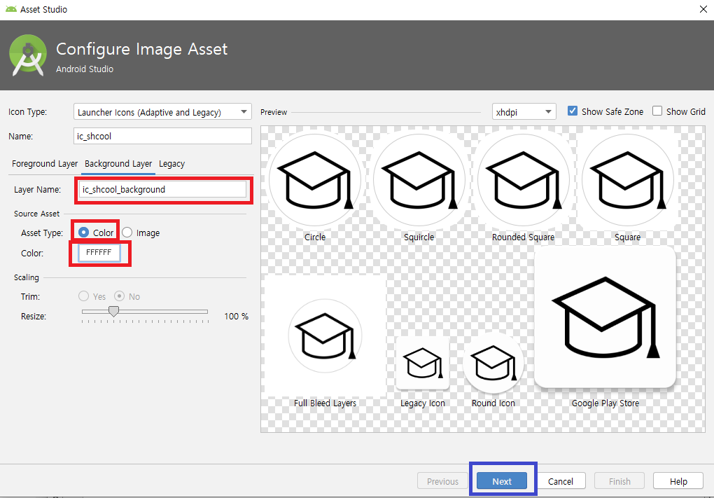 Background Layer를 클릭하면 다음과 같은 화면이 표시됩니다. Layer Name을 지정해주고 Asset Type을 Color로 바꾸고 원하는 Color를 설정합니다 전 흰색(FFFFFF)로 했습니다. Color 입력칸을 클릭하면 UI로도 color를 선택할 수 있습니다. 그 후에 파란색 블록으로 표시된 Next를 클릭합니다.