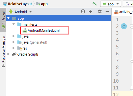 manifests 폴더 아래에 있는 AndroidManifest.xml을 클릭합니다.