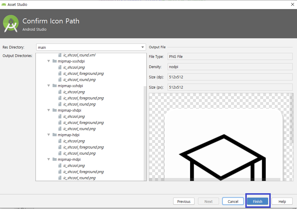 Next를 클릭하면 다음과 같이 프로젝트에 저장될 이미지 파일 정보가 표시됩니다 확인하고 Finish를 클릭합니다.