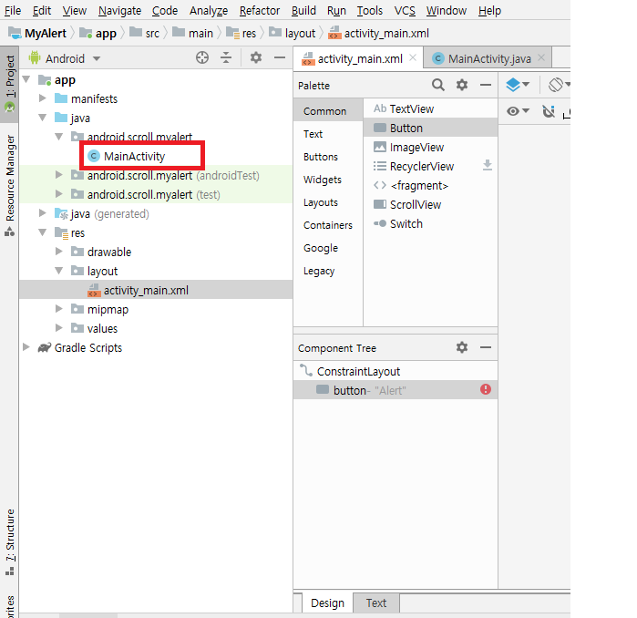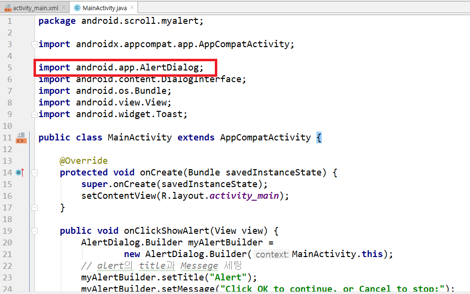 방금 onClick에 지정해준 onClickShowAlert 메소드를 MainActivity에 선언해주겠습니다.
