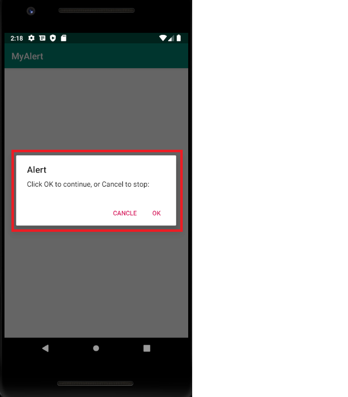 myAlertBuilder.setMessage("Click OK to continue, or Cancel to stop:");