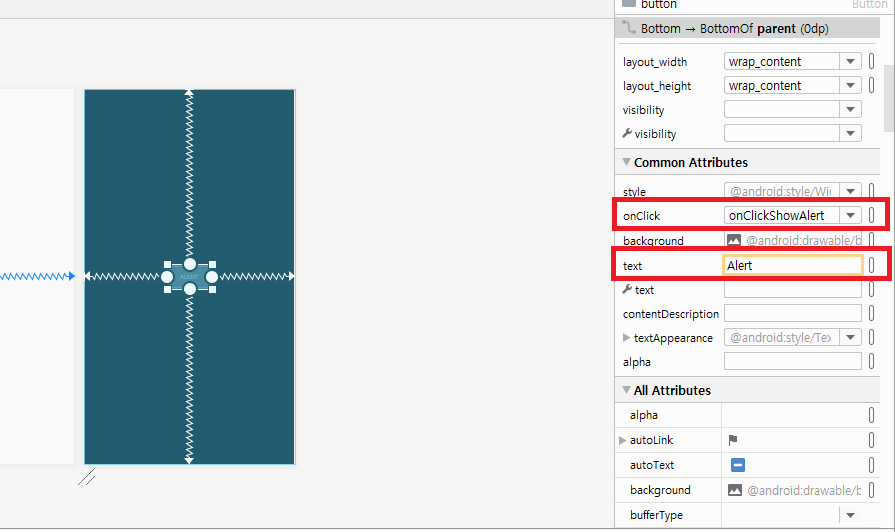 Button을 지정해서 화면 중앙으로 끌고 옵니다. 우측에 보이는 onClick 과 text를 다음과 같이 입력합니다.