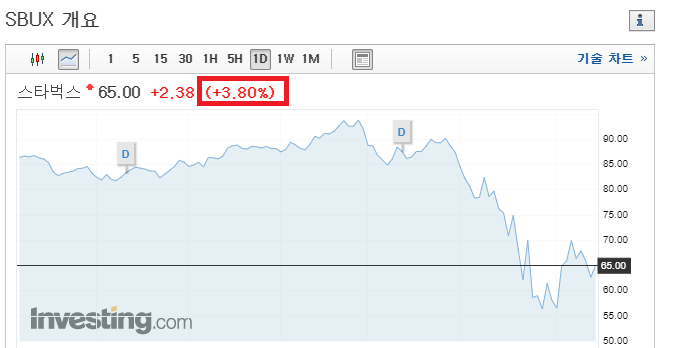 그럼 스타벅스 주가는 어떻게 됐을까요??